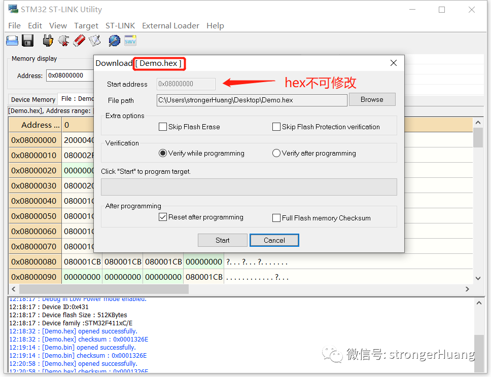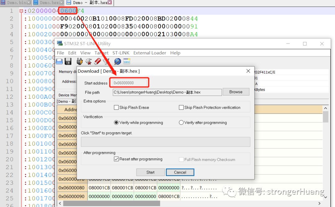 因此,你下载 bin 程序文件的时候,必须要设置起始地址,比如:通过STM32 ST-LINK Utility工具下载bin文件: